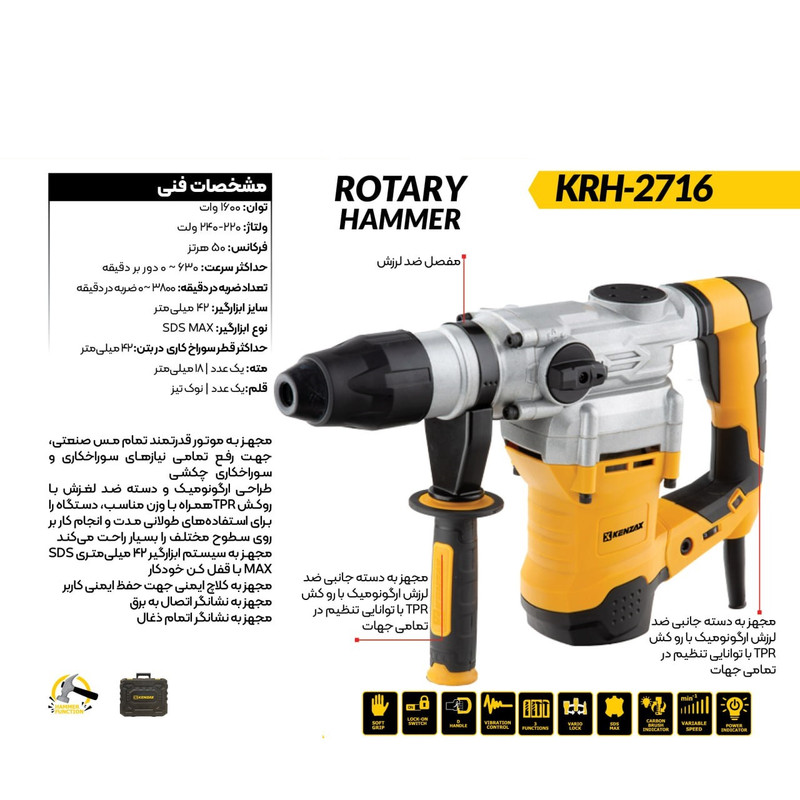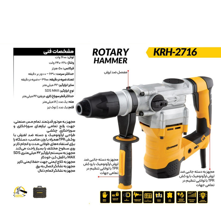 بتنکن دوکاره پنجشیار 42 میلیمتر 1600 وات کنزاکس مدل KRH-2716 BMC یکی از بتنکنهای پیشرفته، خوشساخت و کارآمد بازار است. به جهت آنکه در ساخت قطعات داخلی و بدنه این محصول از بهترین مواد اولیه بهره بردهاند، شما با یک بتنکن فوقالعاده بادوام و دارای طول عمر طولانی مواجه هستید که میتواند برای مدتی طولانی بدون افت کیفیت به شما خدمت کند. اما پیش از آنکه ویژگیهای فنی این محصول را بررسی کنیم، لازم است چند نکته مهم درباره ابزار کارآمد و مهم بتنکن را مرور نماییم.بتنکنها از لحاظ کارایی و ظاهر شباهت زیادی به چکش تخریب دارند و از همین رو ممکن است اشتباه گرفته شوند. باید دانست بتنکن برخلاف چکش تخریب، از توانایی چرخش مته بهره میبرد؛ در حالی که چکش تخریب تنها توانایی ضربههای رفت و برگشتی (چکشی) را دارد. بنابراین بتنکن ابزاری مناسب تخریب و سوراخکاری است؛ در حالی که چکش تخریب تنها در تخریب کاربرد دارد. شما میتوانید با بتنکن به راحتی بتن و مصالح بنایی را سوراخ کنید، لازم به ذکر است با توجه به دو کاره بوئن این محصول امکان سوراخکاری فلز و چوب را نخواهید داشت.بتنکنها به دو دسته چهار شیار و پنج شیار تقسیم میشوند؛ که بتنکنهای پنج شیار از لحاظ کارآمدی و قدرت، در رده بالاتری نسبت به چهار شیارها دارند. در حقیقت بتنکنهای پنج شیار موتور قدرتمند و گریبکسهای بزرگی دارند و از همین رو ابعاد و وزن آنها نیز بیشتر است. همچنین بسیاری از بتنکنهای پنج شیار پیشرفته، همانند این محصول، از پیستونهای ضربهزنی بزرگی نیز بهرهمند شدهاند که آنها را برای انجام عمل تخریب نیز فوقالعاده میسازد. حال بیایید به طور دقیقتر ویژگیهای بتنکن دوکاره پنجشیار 42 میلیمتر 1600 وات کنزاکس مدل KRH-2716 BMC را بررسی کنیم.موتور این بتنکن از قدرت 1600 وات بهره میبرد. این موتور میتواند در حالت آزاد مته را 630 دور در دقیقه بچرخاند و همچنین با کمک پیستون آن، 3800 ضربه در دقیقه تولید کند. در مجموع ظرفیت سوراخکاری این محصول 42 میلیمتر خواهد بود.این موتور از تمامی استانداردهای ایمنی نیز بهره برده و همین موضوع باعث شده تا با یک محصول فوقالعاده بادوام مواجه باشید
