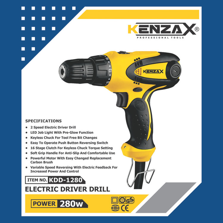 شرکت «کنزاکس» (Knzax) چند مدل پیچگوشتی برقی و شارژی را عرضه میکند که مدل KDD-1280 یکی از این محصولات است. این دستگاه یک پیچگوشتی برقی محسوب میشود. موتور این ابزار 280 وات قدرت دارد و سرعت گردش این موتور بین 0 تا 1650 دوربردقیقه تغییر میکند. با توجه به استفاده از گیربکس صنعتی دو سرعته قابلیت انتخاب گری برای دور کند 0 تا 440 دور بر دقیقه ؛ دور تند 0 تا 1650 دور بر دقیقه در گشتاورهای مختلف متناسب با متریال در اختیار کاربر میگذارد . با تهیه انواع سریهای پیچگوشتی و اتصال آن به دستگاه میتوانید از این ابزار استفاده کنید. قابلیت گردش به هر دو جهت برای باز کردن یا بستن پیچ، برای این محصول در نظر گرفتهشده است. وزن این مدل به حدود 1.1 کیلوگرم میرسد. لازم است بدانید دریل پیچگوشتی کنزاکس مدل KDD-1280 دارای کابلی با طول 3 متری با روکش ضخیم پلاستیکی (Rubber) میباشد . همچنین در بسته بندی KDD-1280 یک جفت ذغال یدکی ئیزارایه شده است با توجه به استفاده از موتور صنعتی طراحی این دستگاه بگونه ایست که جهت تعویض ذغال ها نیاز به باز کردن پوسته دستگاه نخواهید داشت. دریل پیچگوشتی کنزاکس مدل KDD-1280 دارای بلبرینگ حرفه ای و کلید گازی ضد غبار و اهرم انتخاب وضعیت چپگرد و راستگرد مطابق با استاندارد های اروپا است. سیستم گردش چپگرد و راستگرد برای این محصول باعث میشود در حالت پیچگوشتی، بهراحتی پیچها را باز و بسته کنید و در حالت دریل، ورود و خروج مته را با سهولت بیشتری انجام دهید. گشتاور موتور این محصول در 18 حالت مختلف قابل تنظیم بوده و در بیشترین مقدار به 18 نیوتنمتر میرسد. با کمک قابلیت تنظیم گشتاور میتوانید میزان نیروی وارده به سهنظام را تغییر دهید. دسته این محصول با طراحی ارگونومی و روکش TPR نرم جهت جلوگیری از خستگی و لغزش و مقاوم در برابر ضربات حین کار تولید شده است ؛ این محصول به چراغ ال ای دی در انتهای دسته مجهز شده است که با تابش بروی سطح کار انجام فعل را در محیط های کم نور را نیز مقدور مینماید ؛ همچنین این محصول به آویز کمری استیل جهت راحتی کاربر حین کار مجهز گشته است. سه نظام این کالا از مدل اتوماتیک دو تکه بوده ؛ ظرفیت آن 10 میلیمتر است ؛ ظرفیت سوراخکاری آن در چوب 26 میلیمتر و در استیل 10 میلیمتر میباشد .