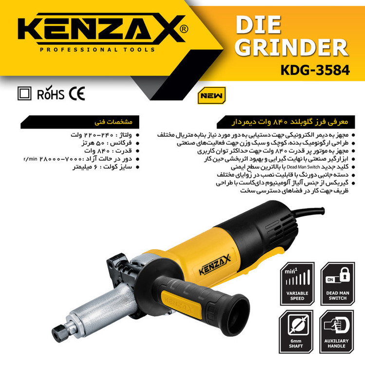 فرز انگشتی گلوبلند کنزاکس مدل KDG3584 ، محصول جدید دیگری از خانواده ابزارهای برقی "کنزاکس"KENZAX میباشد. موتور این دستگاه ازلحاظ ساختار، با دقت بالایی تولید و روی دستگاه نصب میشود و از قدرت بالایی برخوردار است. شستی دستگاه در محلی قرارگرفته تا کاربر بهراحتی آن را فشار داده و از دستگاه استفاده کند. وزن و طول کامل این مدل بسیار مناسب است. KDG3584 عنوان یکی از محصولات شرکت کنزاکس است که نوعی فرز محسوب میشود. از این دستگاه برای برش یا سنبادهزنی روی اجسام مختلف با حفظ ظرافت و دقت بالا استفاده میشود. این مدل دارای یک موتور با قدرت خروجی 840 وات است. سرعت گردش کولت یا سری این فرز به 28000 دوربردقیقه میرسد. شستی این محصول، اهرم پلاستیکی کوچکی است که با زاویه و طراحی مناسبی روی بدنهی دستگاه قرارگرفته است که باعث شده تا کاربر بهراحتی دستگاه را روشن کرده و از آن استفاده کند. برای استفاده از این دستگاه باید لوازم جانبی مخصوصی را تهیه کنید که ازجملهی این وسایل، میتوان به انواع سنگهای استوانهای، صفحات سنبادهی استوانهای یا لوازم برش مخصوص به این نوع فرز، اشاره کرد. این محصول تقریبا 1.9 کیلوگرم وزن دارد و طول کامل آن به 36 سانتیمتر است. فرزها در گونهها و ابعاد مختلفی ساخته میشوند. مینیفرز، فرز بزرگ، فرز انگشتی و فرز مینیاتوری ازجملهی گونههای مختلف فرز محسوب میشوند. کار با این دستگاه نیازمند به کسب حداقل مهارت دارد تا کاربر ضمن انجام دادن کار موردنظر خود، دچار آسیب نشود. از فرز انگشتی برای انجام برش یا سنبادهزنی روی اجسام فلزی یا چوبی و موارد نظیر این، که نیاز به دقت و ظرافت دارند، استفاده میشود. مدل KDG3584 نوعی فرز انگشتی است که از کیفیت ساخت بالایی برخوردار است. این محصول شرکت کنزاکس از یک موتور 840 وات با حداکثر سرعت گردش 28000 دوربردقیقه با کلت 6 میلیمتری برخورداراست.