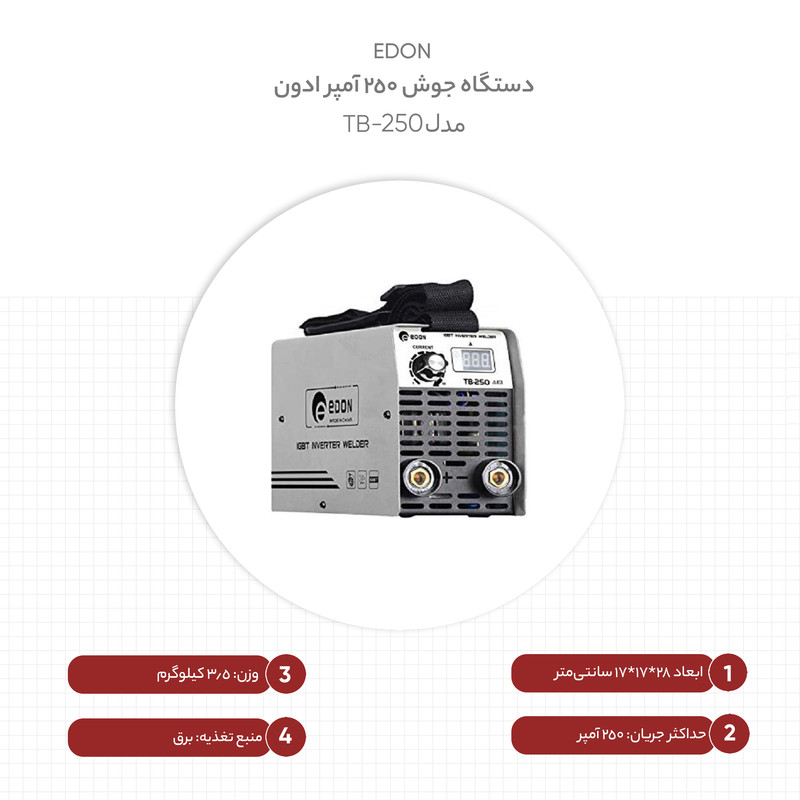 وزن3.5 کیلوگرمانبرداردطول کابل۱.۵ مترحداکثر جریان1۳۰ آمپر واقعیکابلداردمنبع تغذیهبرقویژگیهای دستگاه جوشاینورتر
