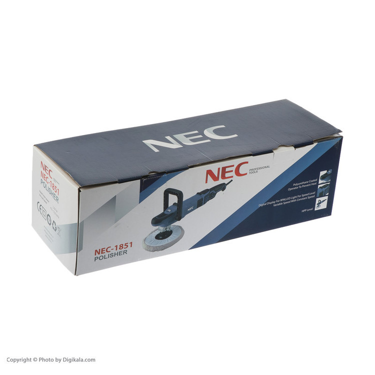 پولیش ان ای سی 1851 با توان 1200 وات و سرعت 1700 دور در دقیقه طراحی گردیده است. طراحی ارگونومیک دسته، کار با این ابزار را راحت کرده است. این دستگاه مجهز به کلید قفل کن به منظور کار مداوم بوده و دارای گشتاور 14 نیوتن متری می باشد. روکش ضد تعریق و بلبرینگ های ضد غبار از ویژگی های منحصر به فرد این محصول است. وزن این دستگاه 2.5 کیلوگرم بوده و ولتاژ 220 ولت / 50-60 هرتز دارد. این دستگاه مجهز به سیستم پیشرفته و سریع قفل کن شفت و سیستم گردش هوای داخلی پیشرفته است و دسته جانبی ضد لرزش دارد. صفحه پولیش قابلیت تعویض سریع و آسان دارد و دارای کلید دیمر جهت کنترل دور است.پولیش برقی مجهز به دیسک با قطر 180 میلی متر، کلید برق مقاوم در برابر گرد و غبار و بلبرینگ ضد گرد و غبار می باشد. از دیگر مزایای این دستگاه می توان به ثابت بودن توان و دور تعیین شده دستگاه در شرایط کاری متفاوت اشاره نمود. نوع پولیش دستگاه از جنس پوست بره و سمباده بوده و به همراه آن صفحه لاستیکی ضخیم، آچار مخصوص، نمد پشمی و صفحه مخصوص سنباده پارچه ای ارائه می شود. پولیش ان ای سی ساخت کشور چین است