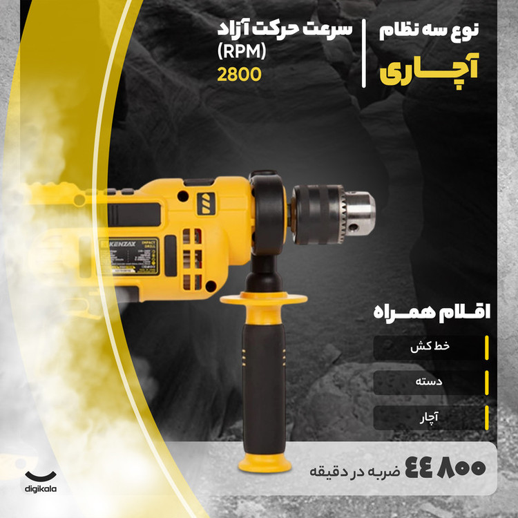 دریل چکشی کنزاکس مدل KID-178 یک گزینه کاربردی برای مصارف خانگی و کارهای سبک صنعتی است که با توان ۷۸۰ وات و ولتاژ کاری بین ۱۸۰ تا ۲۴۰ ولت، قدرت مناسبی برای انواع سوراخکاری در چوب، فلز و مصالح ساختمانی فراهم میآورد. این دستگاه با بهرهگیری از مکانیزم چکشی و نرخ ضربه ۴۴۸۰۰ ضربه در دقیقه، قابلیت نفوذ بالا در سطوح سخت را دارد و برای انجام پروژههای نیمهسنگین خانگی کاملاً مناسب است. سهنظام آچاری ۱۳ میلیمتری از برند پیکاک به همراه طراحی فلنج مخصوص سیستم ضربهزن، تعویض مته را سریع و مطمئن کرده و دوام کاری دستگاه را افزایش میدهد. این مدل با سرعت گردش آزاد تا ۲۸۰۰ دور در دقیقه، قابلیت تنظیم سرعت بهوسیله کلید دیمر را دارد. همچنین وجود شستی چپگرد و راستگرد، دکمه قفلکن کلید و کلید ضد غبار، کنترل بیشتری در حین کار به کاربر میدهد. بدنهی دستگاه از جنس ABS و دستهی جانبی از جنس PP با روکش ضدتعریق TPR طراحی شده تا علاوهبر استحکام، راحتی استفاده در طولانیمدت را تضمین کند. در بستهبندی این محصول، اقلامی چون خطکش عمقسنج، دسته کمکی، آچار سهنظام و ذغال یدکی نیز قرار دارد.