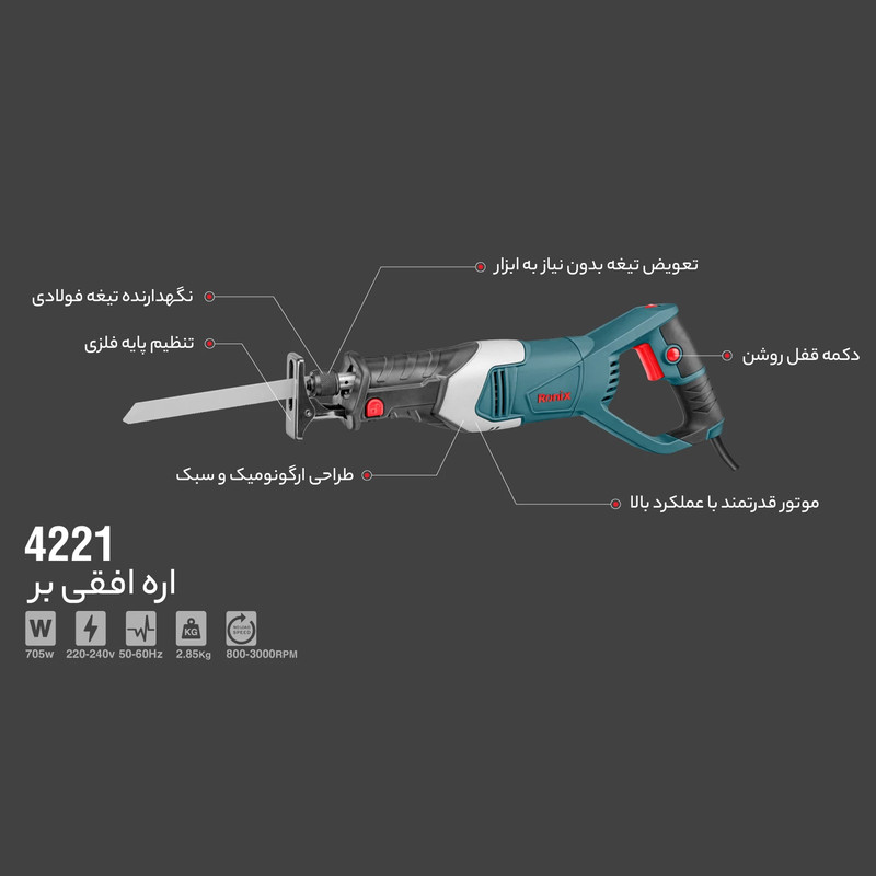 مجهز به ابزار گیر فلزی. مجهز به سیستم تعویض تیغ اره بدون نیاز به استفاده از ابزار. دارای قابلیت تنظیم عمق برش برای فعالیت های متفاوت. دارای دیمر تنظیم سرعت. دارای طراحی منحصر به فرد و وزنی سبک جهت حمل آسان میباشد.
